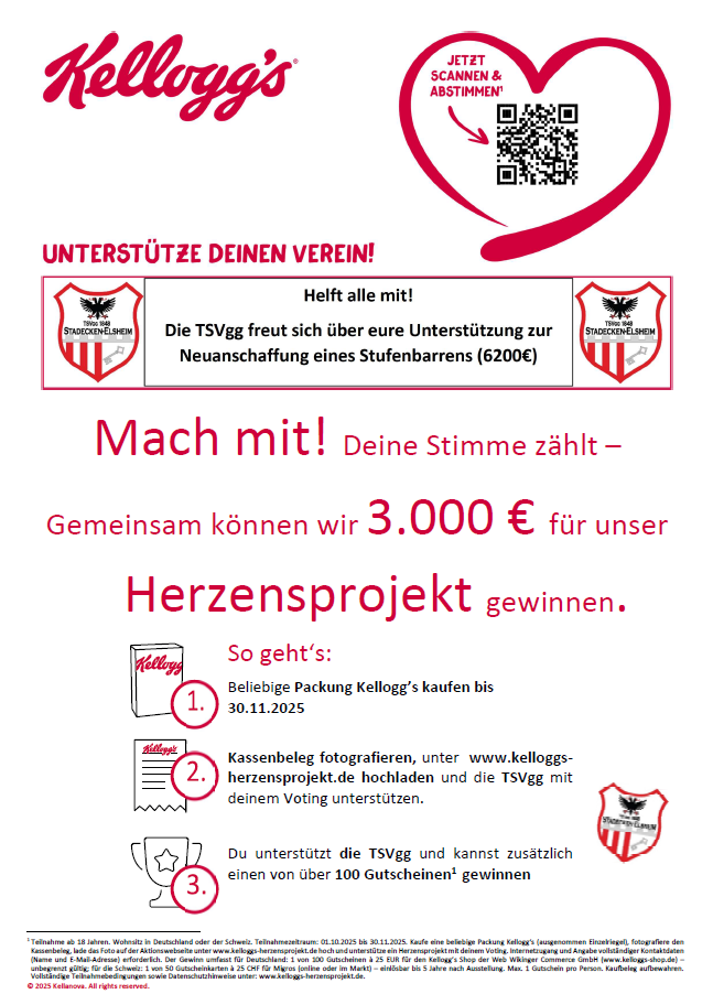 EURE STIMME ZÄHLT! Bis 30.11.25: Kelloggs Produkt kaufen, Kassenbon hochladen und für die TSVgg abstimmen! Wir sagen DANKE!