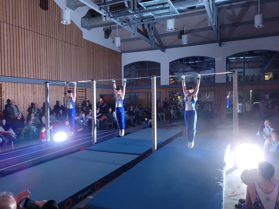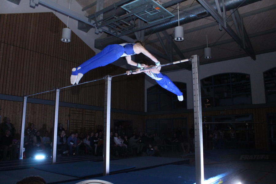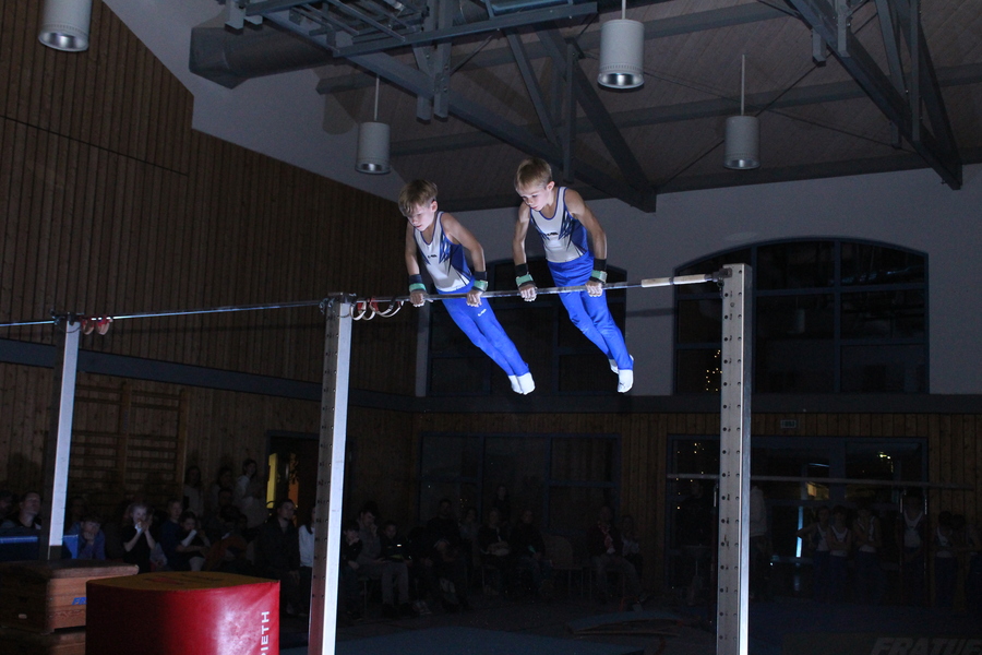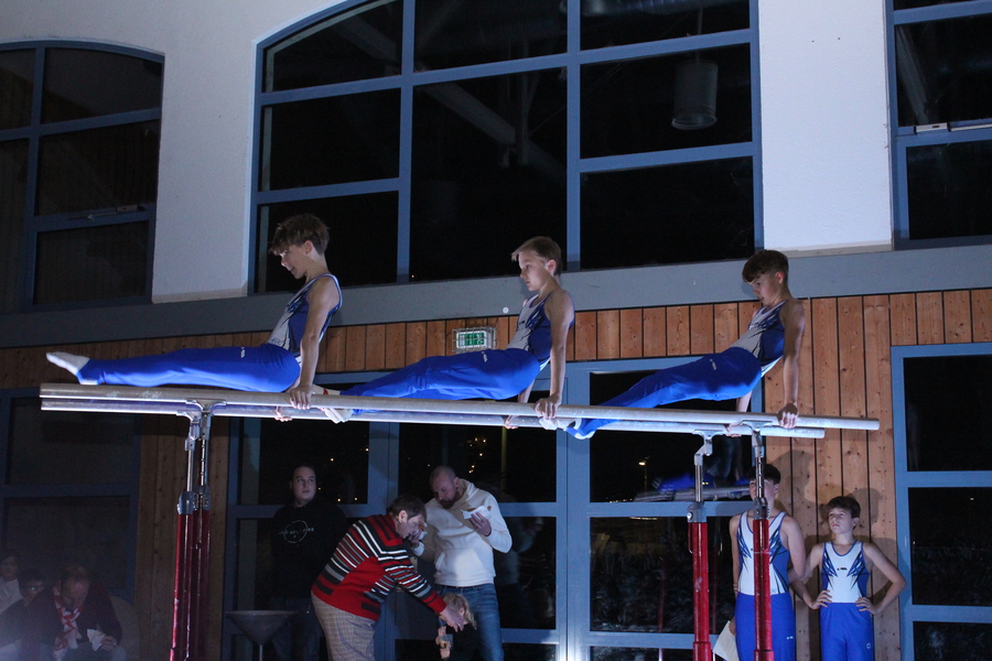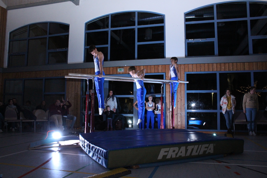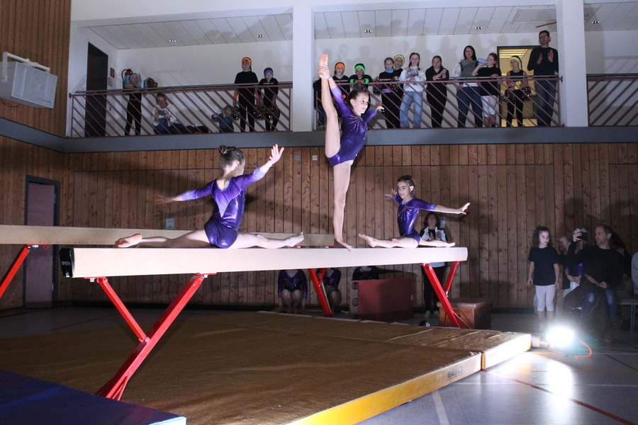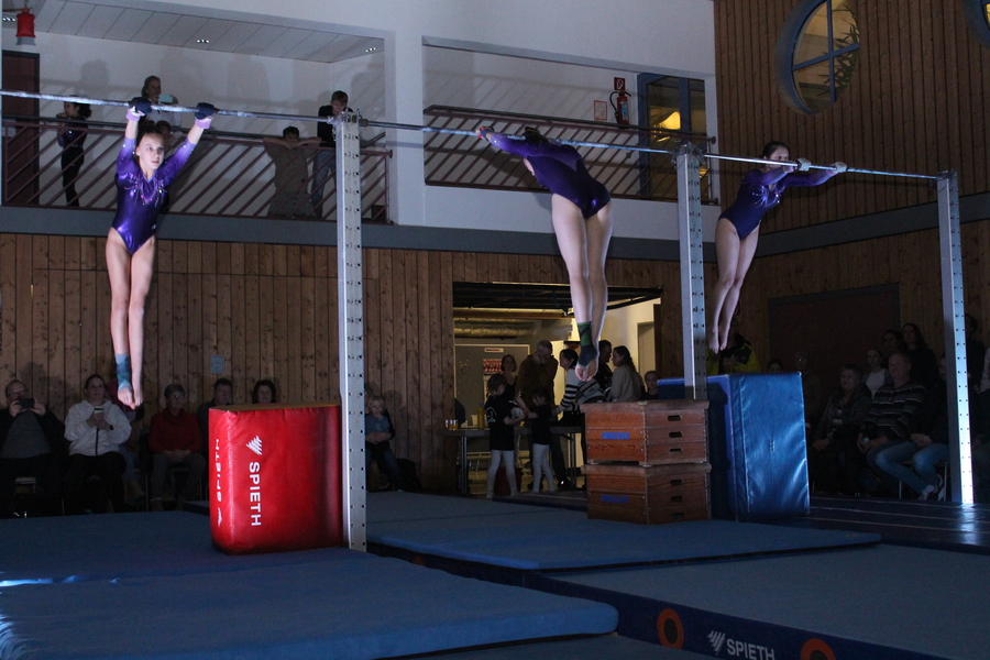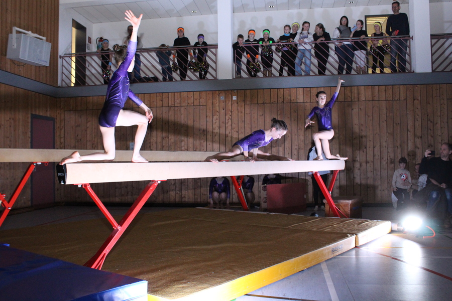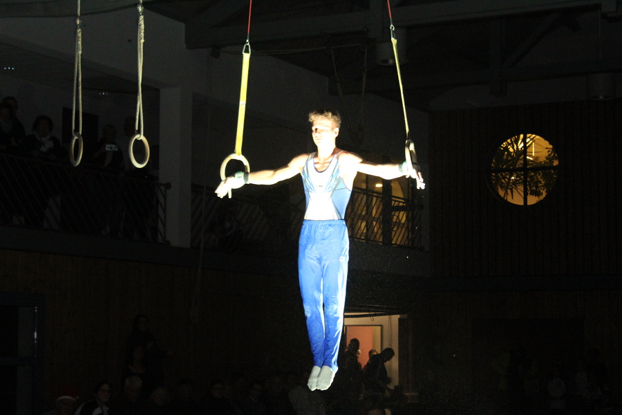 Etwas ganz Besonderes ließen sich die Trainerinnen und Trainer der Leistungsgruppen weiblich und männlich einfallen: An den einzelnen Geräten, die in der ganzen Halle verteilt aufgebaut waren, zeigten die Turnerinnen und Turner im Alter von 10 bis 24 Jahren einzeln oder in Gruppen einzigartige Choreografien und die ganze Palette ihres Könnens. Auch für die Zuschauer ein einmaliges Erlebnis, da sie sich mit der Bestuhlung mitten im Geschehen befanden. Die jeweiligen Acts wurden durch die einzelnen Spot-Beleuchtungen im dunklen Saal buchstäblich ins Rampenlicht gerückt.