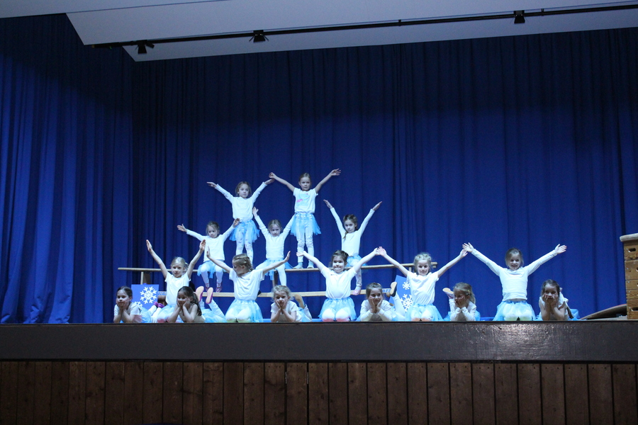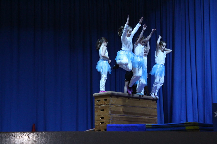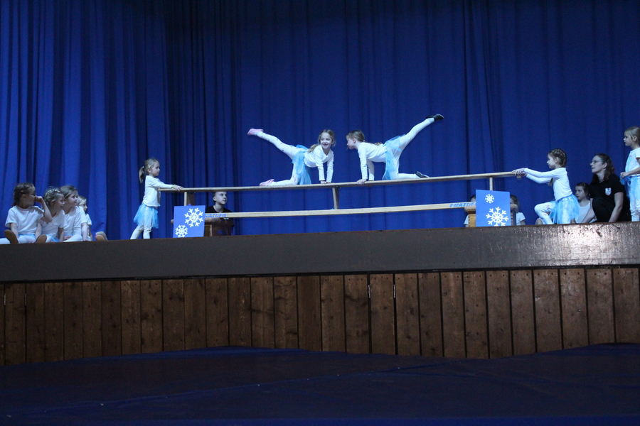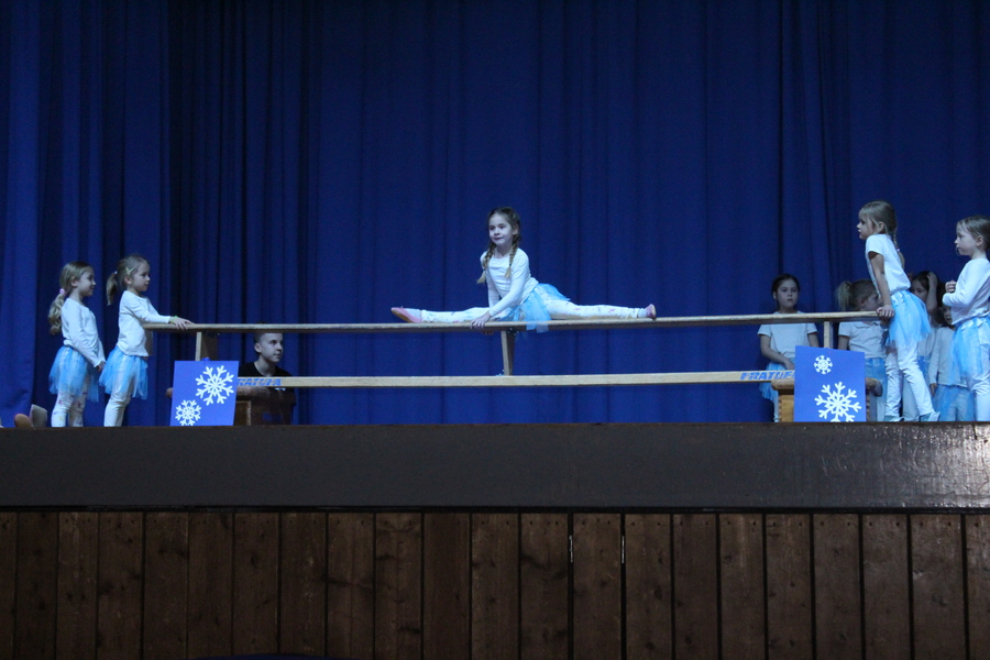 Den Showteil eröffneten die 5 bis 7-jährigen Mädchen unter der Leitung von Melanie Herrmann, Jutta Kleemann und Luisa Kleemann, die als Schneeflocken einen Einblick in ihr Aufwärmtraining zeigten und am Boden, Sprung und auf der Bank ihr Können präsentierten.