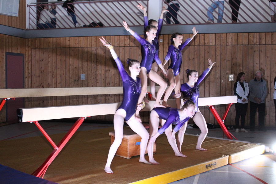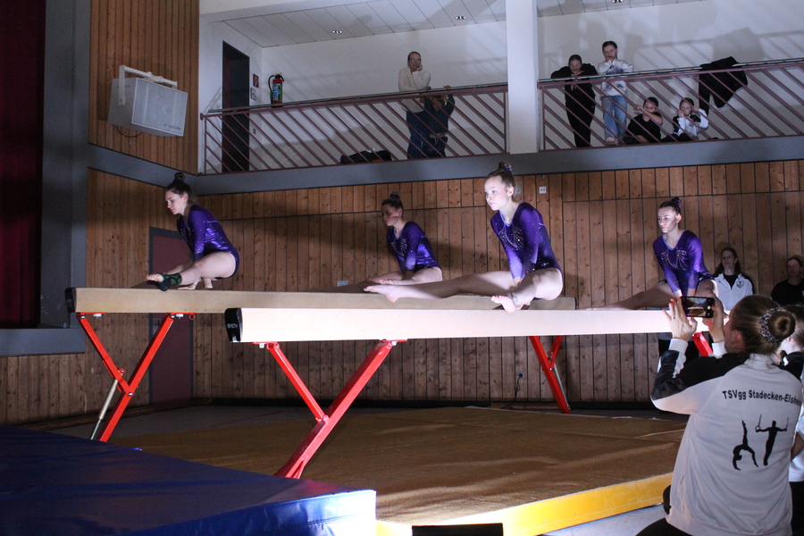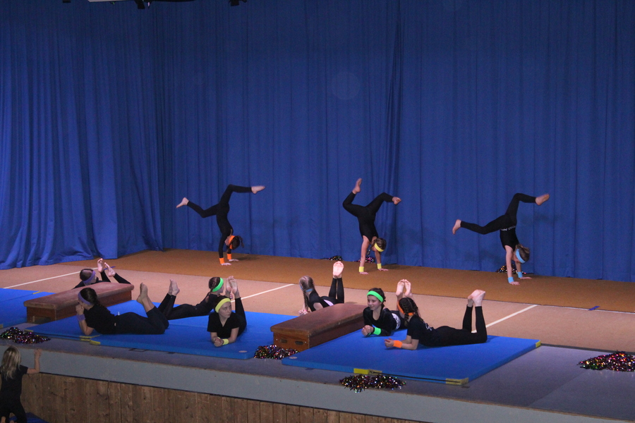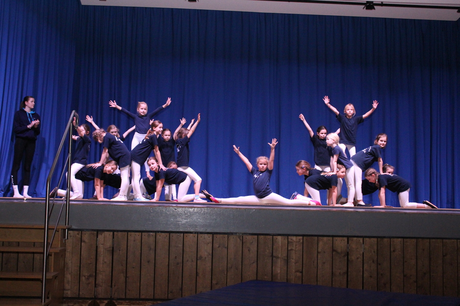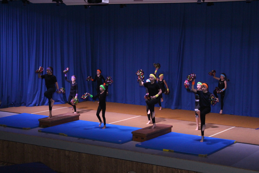 Im Anschluss präsentierten die jungen Damen zwischen 9 und 12 Jahren unter der Leitung von Angela Schlesinger und Tanja Endemann im passenden Fitnessoutfit eine kleine Akrobatikshow, kombiniert mit flotten Pompon-Choreografien und Elementen an Boden und Kastenoberteilen.